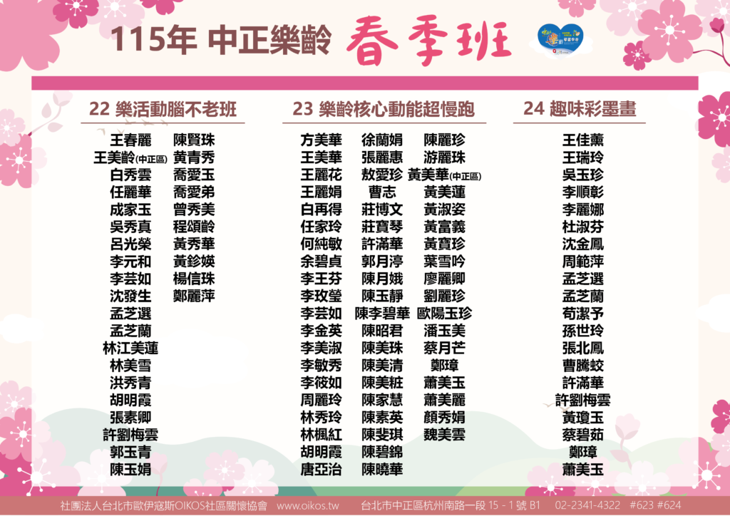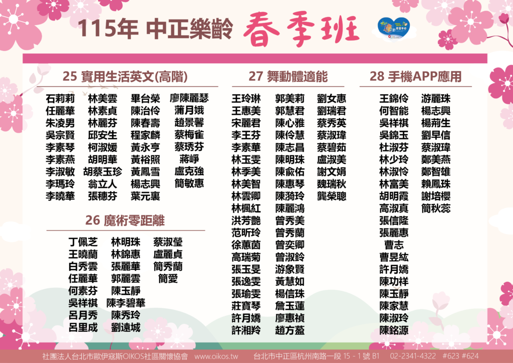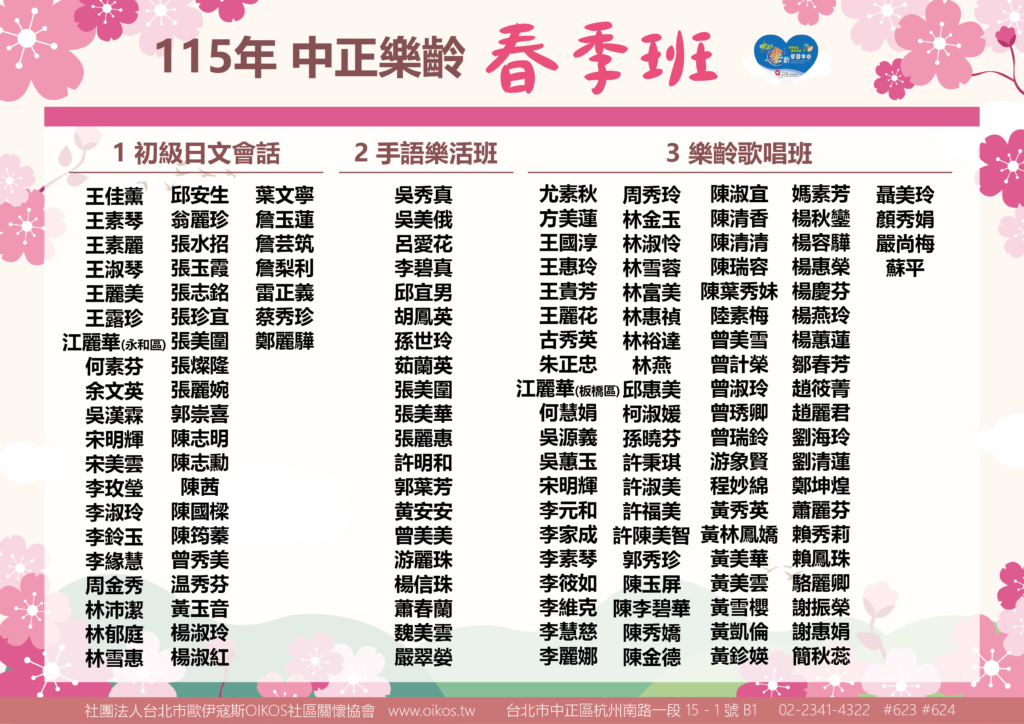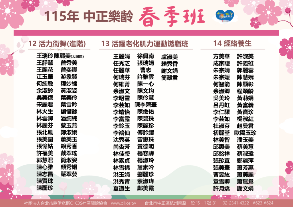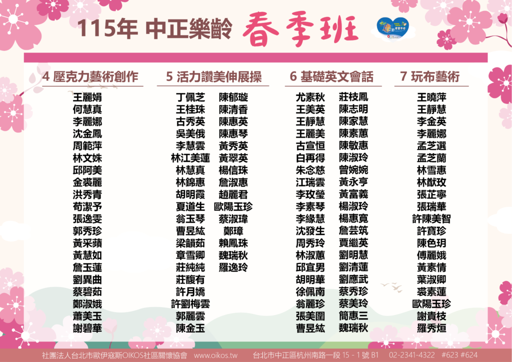 感謝大家的熱烈參與!本季各班別的網路報名結果已公布,請查閱公告。如有任何疑問,歡迎於上班時間與我們聯繫。